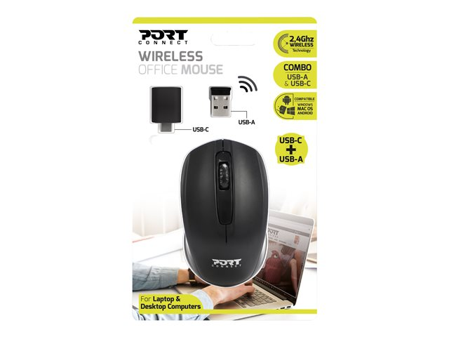 La souris de bureau sans fil PORT Connect est parfaite pour une utilisation professionnelle quotidienne avec ses 3 boutons et sa molette de défilement. Son design ergonomique, ambidextre et léger offre un confort d'utilisation optimal et son capteur optique de 1000 DPI assure une grande précision. Compatible avec Windows, MacOS et Android, sa double connectivité USB-A et USB-C la rend universelle. Il suffit de la brancher pour être opérationnel grâce à son installation Plug & Play.