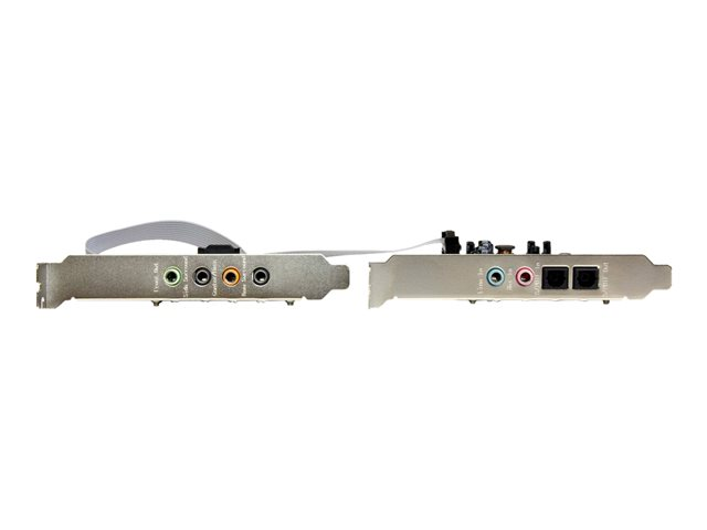 Cette carte son PCI-E 7.1 voies constituera un ajout sonore de qualité à votre home cinéma. Vous vivrez une expérience unique grâce à l'audio optique numérique cristalline de ses ports d'entrée et de sortie SPDIF. Fonctionnement polyvalent Cette carte son polyvalente sert avec un grand nombre d'appareils audio. Et avec sa sortie optique numérique SPDIF ou analogique de 3,5 mm, inutile de vous soucier du type de connexions prises en charge par vos appareils. Envoyez l'audio numérique vers votre récepteur optique ou votre DAC, ou encore l'audio analogique vers votre chaîne audio. Cette carte adaptateur son surround 7.1 aux fonctions de lecture et d'enregistrement jusqu'à 24 bits et 192 kHz produit un son haute définition d'une formidable qualité sonore. Installation simple Contrairement aux cartes son ordinaires, cette carte est conçue pour les ordinateurs compacts et donc, parfaite pour les systèmes HTPC (home cinéma sur PC). Elle répartit les multiples ports sur une carte principale plus un support en-tête novateur distinct. Cette carte comporte des supports standard et faible encombrement (demi-hauteur). Rien de plus facile que d'installer la carte son surround 7.1 voies ! C'est le choix qui s'impose pour quiconque recherche une solution simple pour améliorer le son, comme les amateurs de musique ou les professionnels du mixage. Plusieurs options de sortie Misez sur l'évolutivité en branchant rapidement un microphone ou d'autres dispositifs d'enregistrement dans les deux prises d'entrée stéréo 3,5 mm ou audio numérique SPDIF de votre ordinateur. Le modèle PEXSOUND7CH bénéficie de la garantie StarTech.com de 2 ans et de l'assistance technique à vie gratuite.