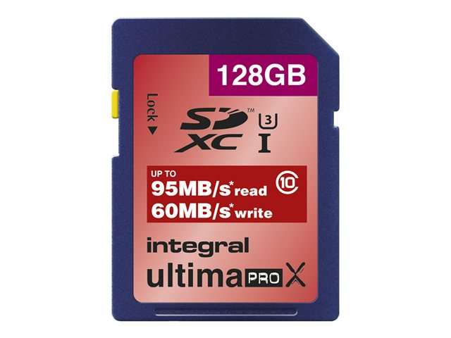 Description du produit Integral UltimaPro X - carte mémoire flash - 128 Go - SDXC UHS-I Type du Produit Carte mémoire flash Format Carte mémoire SDXC UHS-I Capacité de stockage 128 Go Indice de vitesse UHS Class 1 / Class10 Tension d'alimentation 2.7 - 3.6 V Garantie du fabricant Garantie de 5 ans -