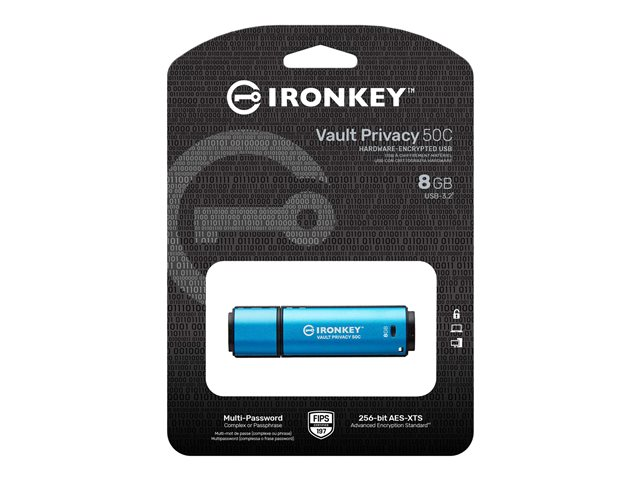 Les clés Kingston IronKey Vault Privacy 50 sont des clés USB Type-A et USB Type-C haut de gamme qui offrent une sécurité de niveau entreprise avec un chiffrement matériel AES 256 bits certifié FIPS 197 en mode XTS, incluant des protections contre les BadUSB avec des firmwares signés numériquement et contre les attaques par mot de passe Brute Force. Le VP50 a fait l'objet d'un test de pénétration (Pen Tested) pour une sécurité de niveau entreprise. Parce qu'il s'agit d'un stockage crypté sous le contrôle physique de l'utilisateur, la série VP50 est supérieure à l'utilisation d'Internet et des services en nuage pour protéger les données.