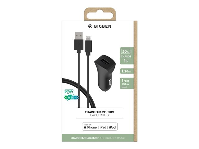 BIGBEN Connected - Adaptateur d'alimentation pour voiture - 2.4 A (USB) - sur le câble : Lightning - noir