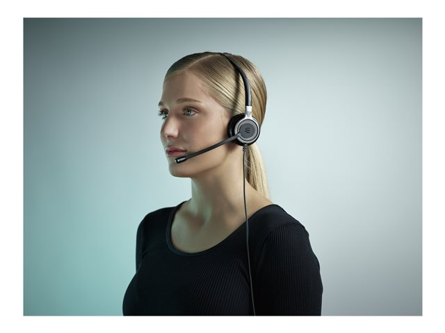 Micro-casque filaire USB binaural avec réduction de bruit active et capteur de proximité. Cette solution pour centres de contacts et bureaux vous offre un son supérieur, un traitement simplifié des appels, une grande résistance et un confort prolongé.