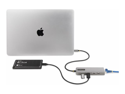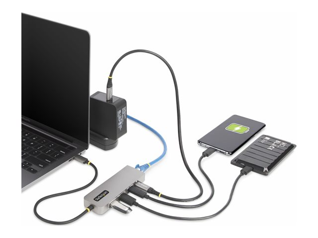 Text | Ce hub USB Type-C avec Ethernet 2,5 Gigabits et Power Delivery USB 100W en mode pass-through ajoute trois ports USB 3.2 Gen 2 (10 Gbps) (2x USB-A, 1x USB-C) à un ordinateur compatible USB-C. Connectez le hub USB à un port USB-C sur un ordinateur portable à l'aide du câble hôte USB-C intégré de 30 cm. Chargez un ordinateur portable hôte en connectant son alimentation USB-C au port Power Delivery (PD) 3.0 USB. La compatibilité descendante avec les périphériques USB 2.0 (480 Mbps) assure la prise en charge d'une large gamme de périphériques USB modernes et anciens.