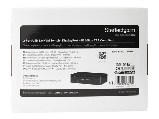 StarTech.com KVM switch écran clavier souris USB à 2 ports DisplayPort 4K 60 Hz - Commutateur KVM DP 1.2 avec hub USB 3.0 (SV231DPU34K) - Commutateur écran-clavier-souris/audio/USB - 2 x KVM / audio / USB - de bureau - Conformité TAA SV231DPU34K